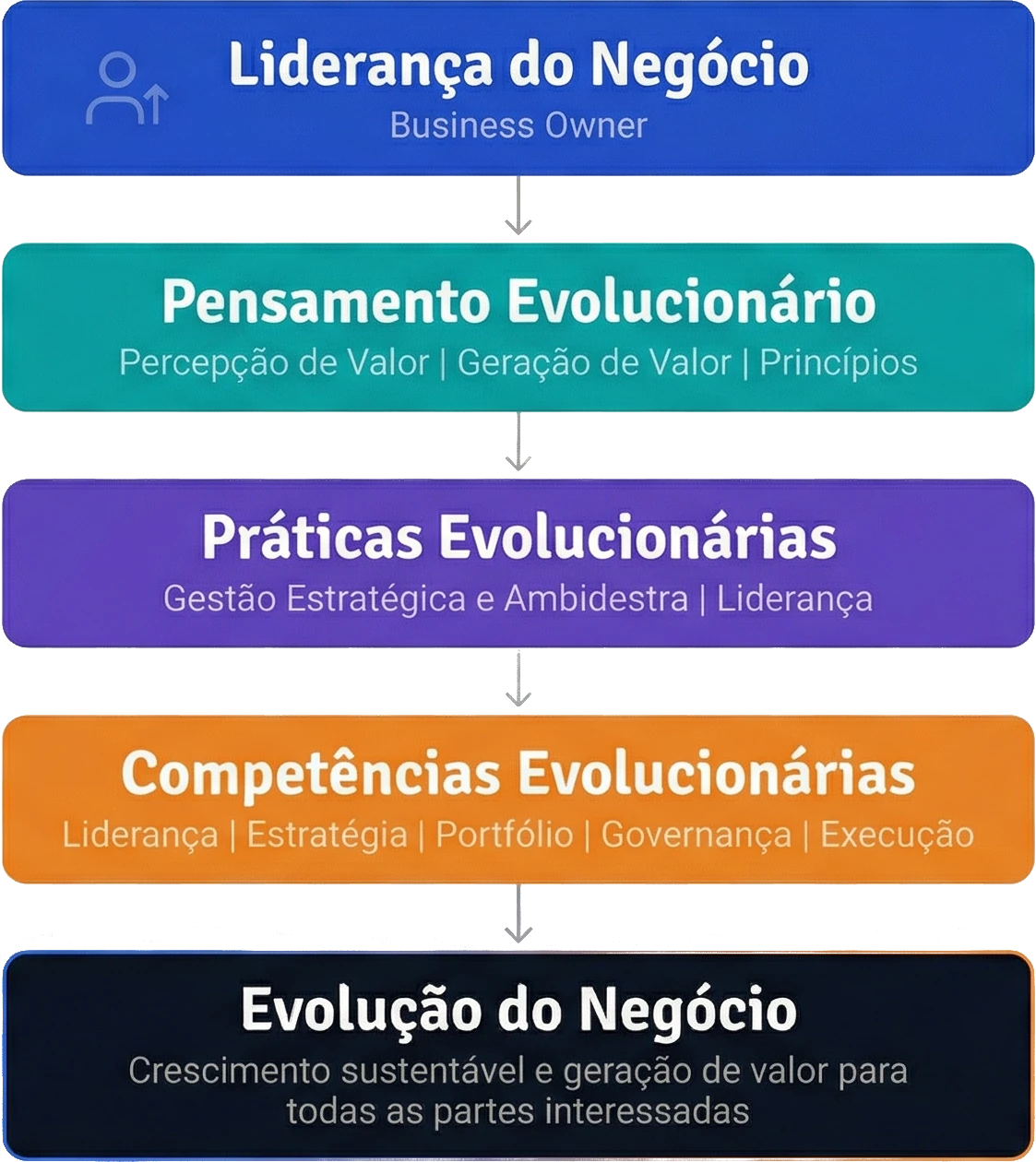 Essa atuação se sustenta por um pensamento evolucionário que orienta decisões e direciona o negócio ao longo do tempo, por práticas evolucionárias que permitem arquitetar o futuro e executar a evolução de forma contínua, e pelo desenvolvimento de competências evolucionárias que integram liderança, estratégia, portfólio, governança e execução. É essa base que transforma a evolução do negócio em uma capacidade organizacional consistente e escalável.
