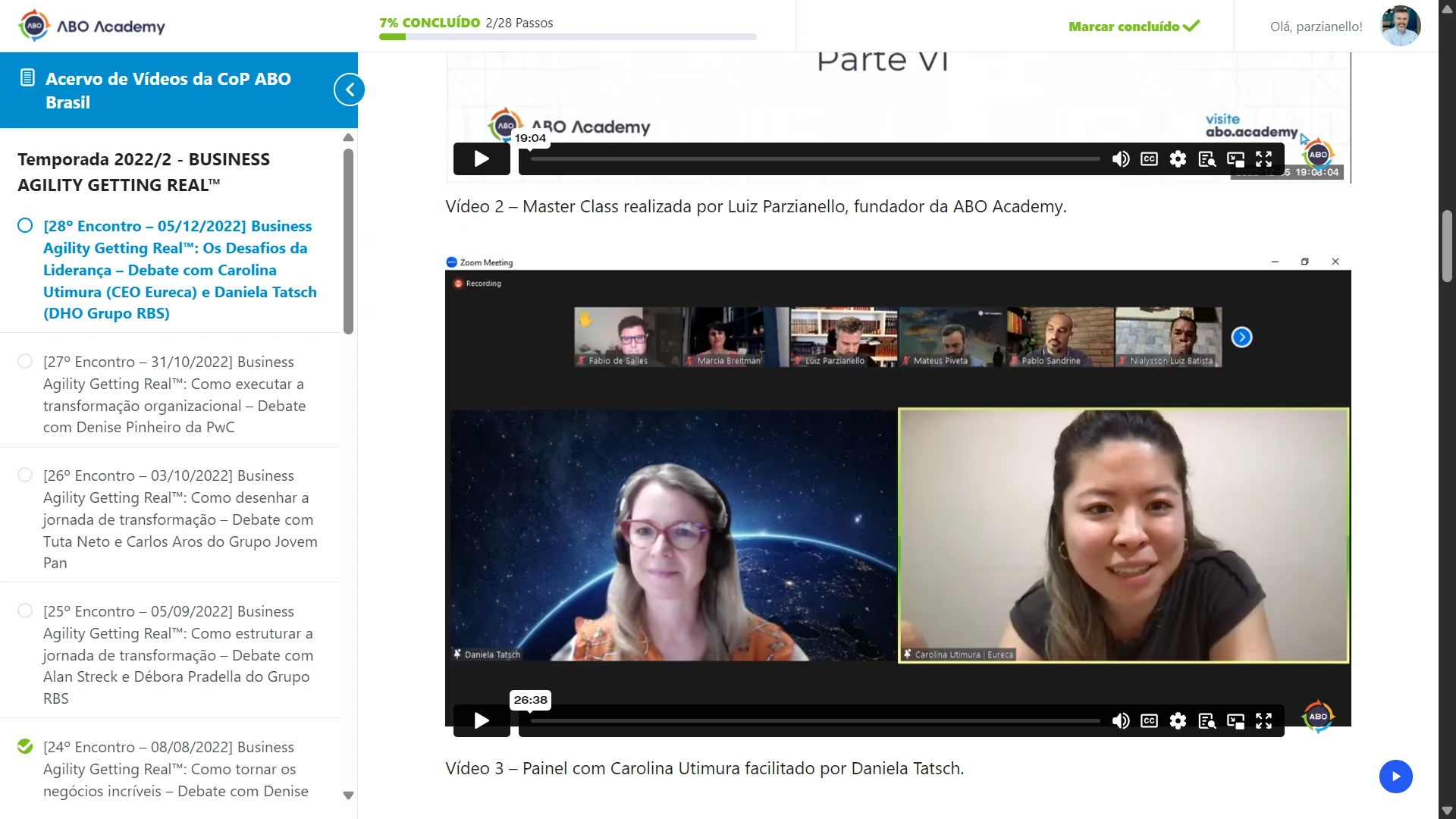 Cada lição reúne o vídeo completo do evento, com duração mínima de 1h30, além das informações compartilhadas no chat pelos participantes, e você pode interagir com o acervo registrando perguntas, comentários e percepções diretamente nos espaços de comentários de cada encontro. Todo o material é gratuito para membros da plataforma: basta criar sua conta na ABO Academy, fazer login e retornar a esta página para assistir aos vídeos completos.